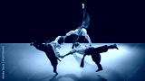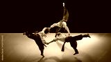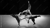 Three dancers hold hands mid-performance, creating motion with high kicks and synchronized movements, symbolizing unity in Hopak. Concept of traditions, folk style, art and history. Ad
