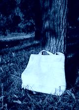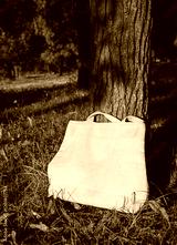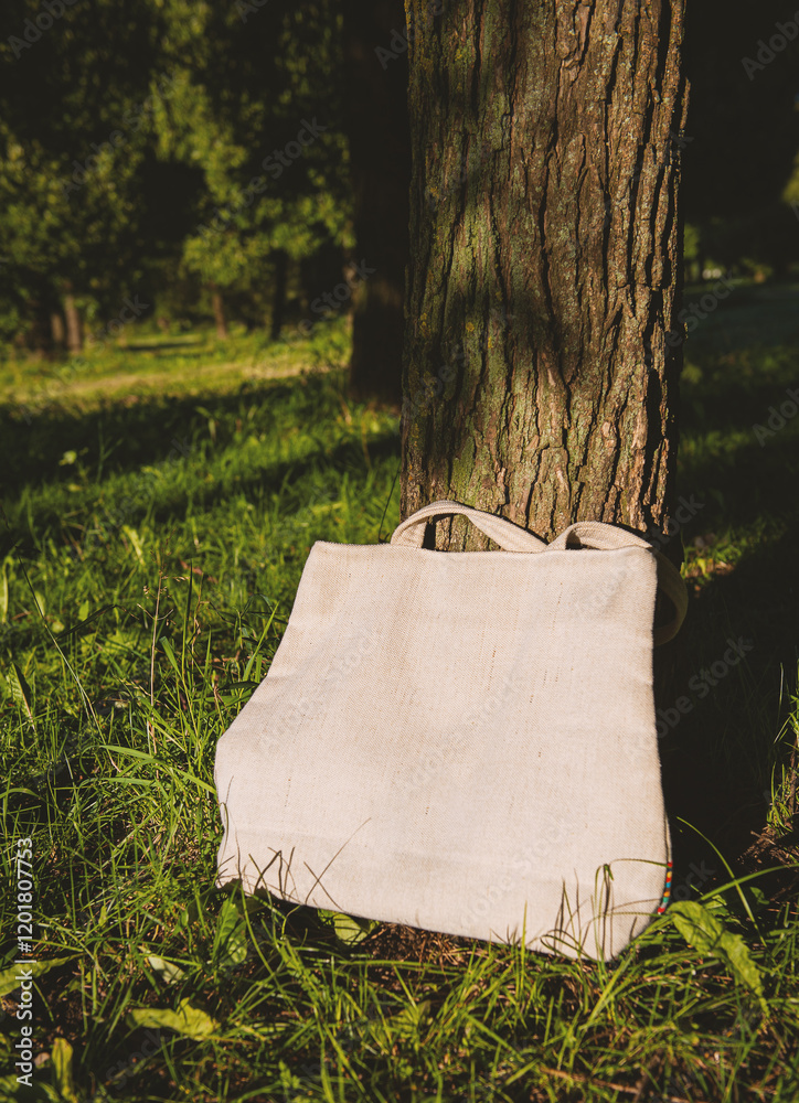 White canvas tote bag mockup template with long handles among the green plant leaves near the tree outdoor
