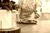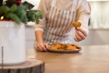 woman holding plate of delicious gingerbread cookies at home, close up. focus on cookies. Christmas time