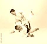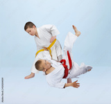 Two karateka boys are training throws