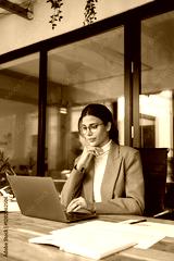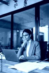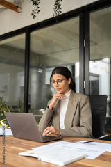 Focused professional financial it specialist latin hispanic business lady working on laptop pc sitting in office. Middle eastern indian woman using computer technology app for work online. Vertical