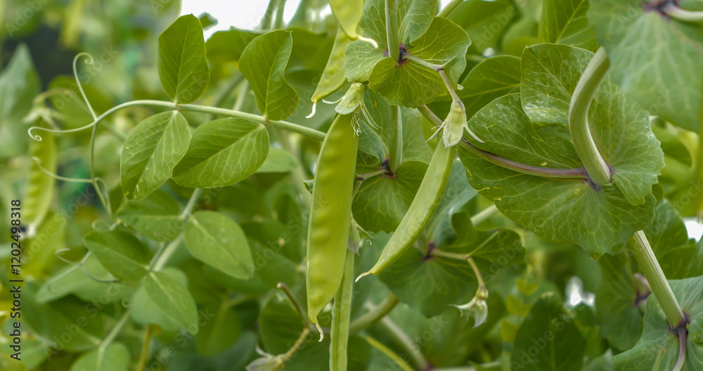 DOF, CLOSE UP: Pea pods dangle gracefully among fresh green leaves in a thriving vegetable garden. Ripening of green peas in springtime. Organic gardening and home production of fresh healthy food.