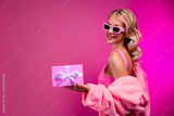 Photo of lovely young lady model holding deliver giftbox wear christmas fur coat isolated on pink vibrant background