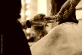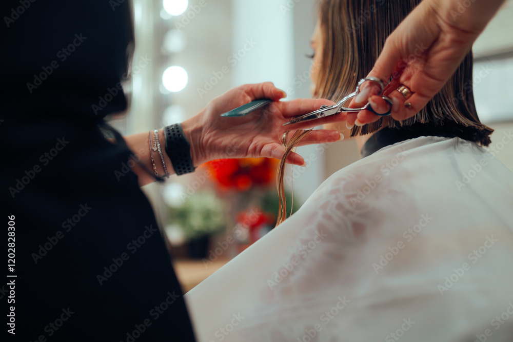Woman Cutting Hair Short in a Beauty Salon. Professional beauty salon worker executing perfect ends trimming