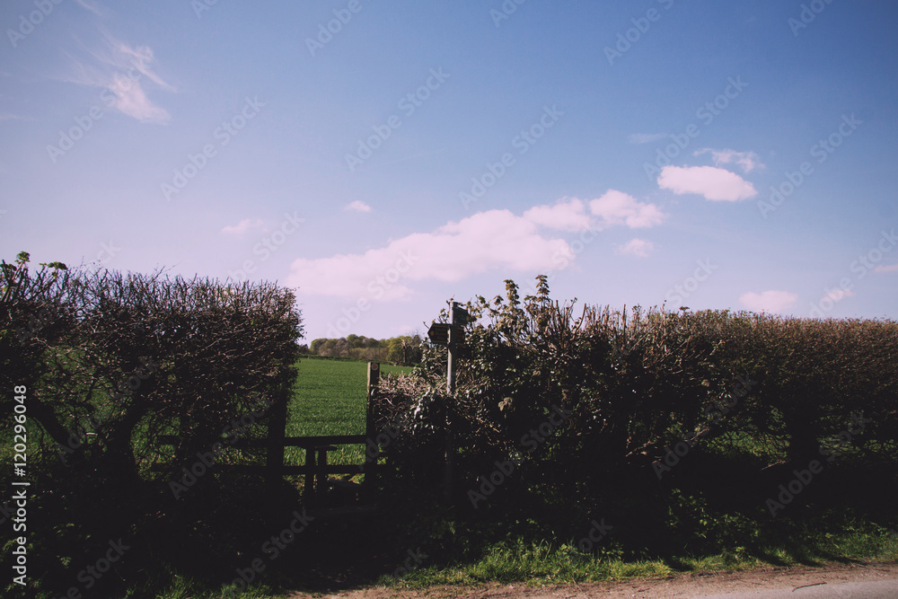 Wooden country stile in a hedge leading to field Vintage Retro F