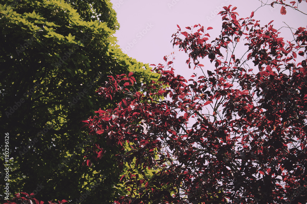 View of red and green leaves in the sunlight Vintage Retro Filte