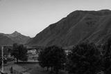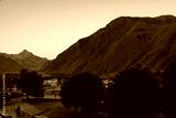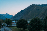 Sunrise in the mountains, a village at the foot of the Caucasus Mountains. A settlement in the mountains. Mountain ranges at dawn