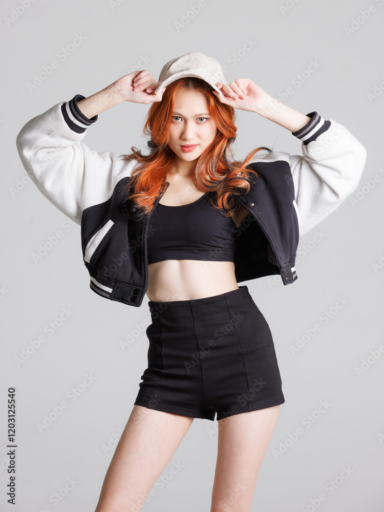 Fashion portrait of asian beautiful sexy cheerful confident young woman with long orange hair model wearing fashionable black outfit and cap standing pose looking camera on white background in studio.