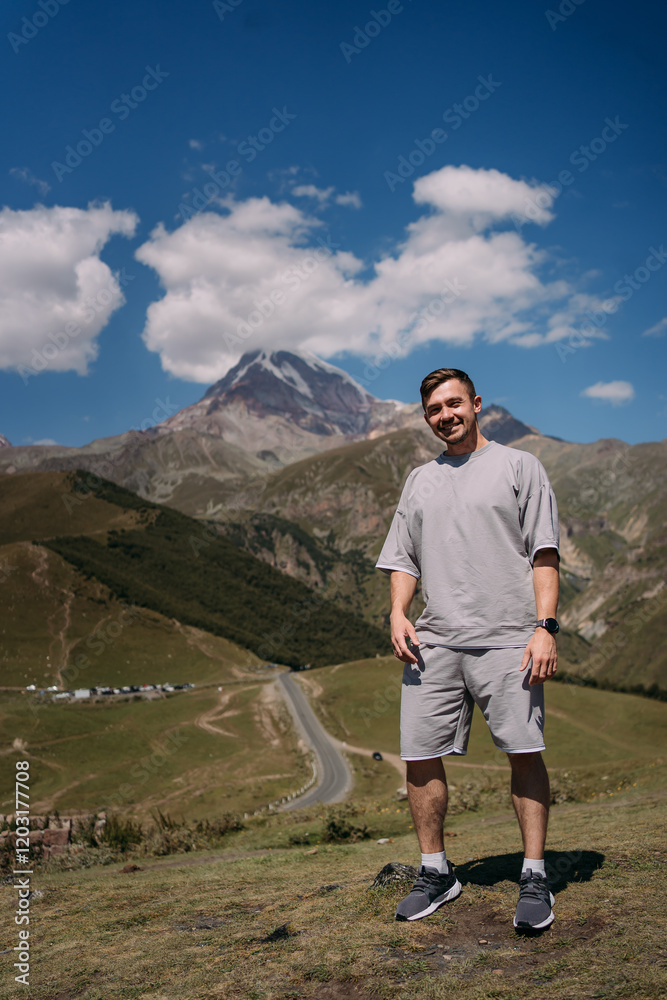 Man standing in the mountains near Kazbek in Georgia, basking in sunlight with a serene expression, with green valleys, rugged peaks, and a clear blue sky in the background. Giving a thumbs up