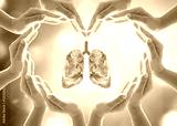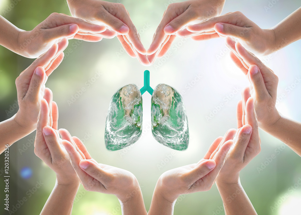 Healthy lung shape world design logo concept idea with heart-shape hands protection. Element of this image furnished by NASA