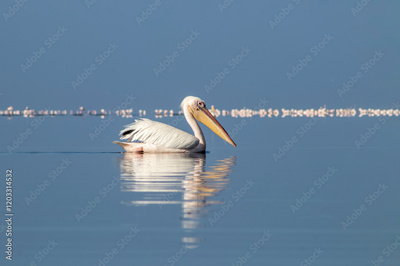 African wild birds. A lone white pelican on a blue lagoon on a sunny day