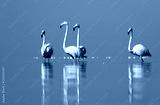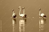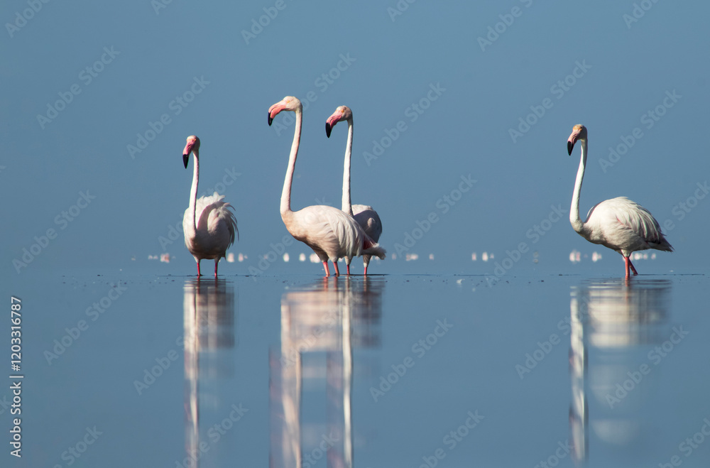 African wild birds. A flock of great flamingos on the blue lagoon against the bright sky