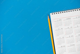 close up of calendar and pencil on the blue table background, planning for business meeting or travel planning concept