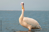 African wild birds. A lone Great pelican on a blue lagoon on a sunny day