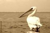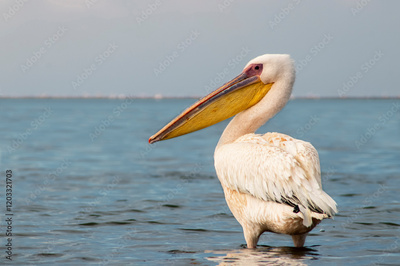 African wild birds. A lone Great pelican on a blue lagoon on a sunny day
