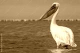 African wild birds. A lone Great pelican on a blue lagoon on a sunny day