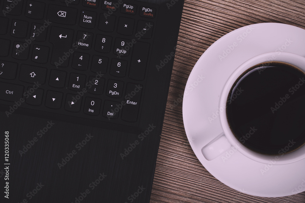 Lay flat image of a laptop and coffee cup Vintage Retro Filter.