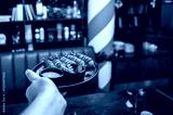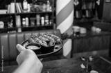 A hand holding a black plate with skewered snacks drizzled with sauce, accompanied by a small bowl of dipping sauce and seasoned vegetables, set in a cozy restaurant atmosphere.