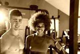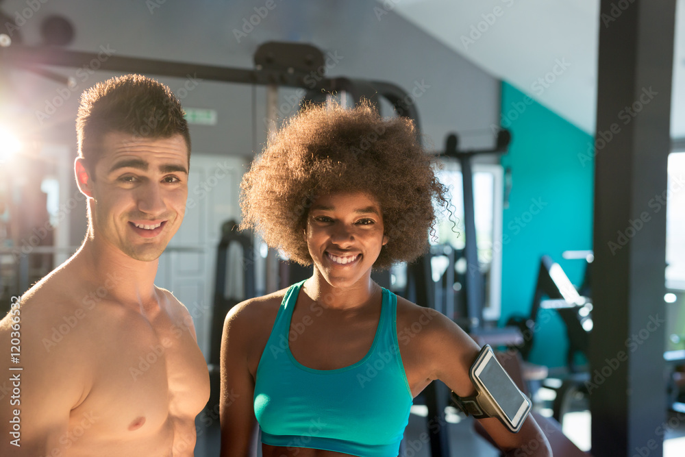 Athletic man and afro american woman posing in gym. Couple that trains together stays together