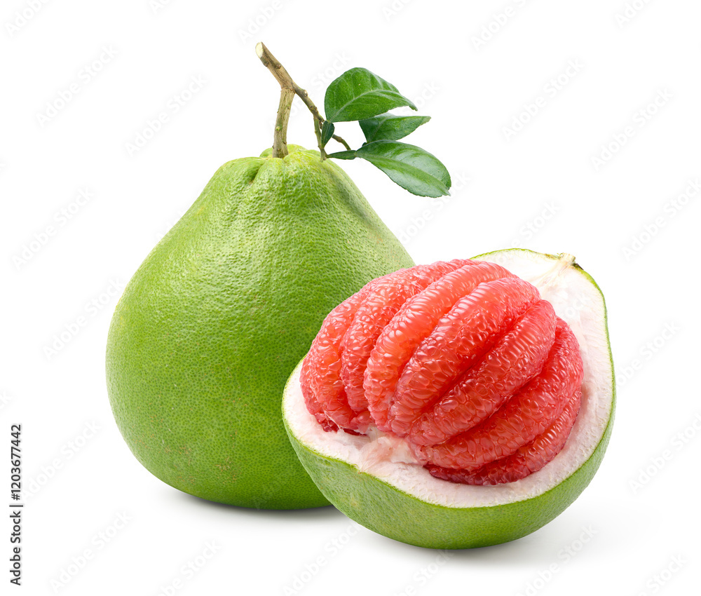 Pomelo fruit (Red pomelo, tubtim siam or ruby siam) with cut in half isolated on white.