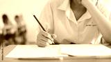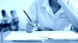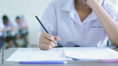 Close up hand of student reading and writing exam answer sheets exercises with stress in classroom