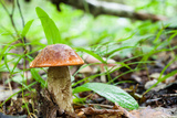 Porcini white mushroom macro nature photo. Autumn forest scene with Boletus edulis. horizontal, soft focus