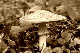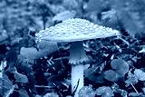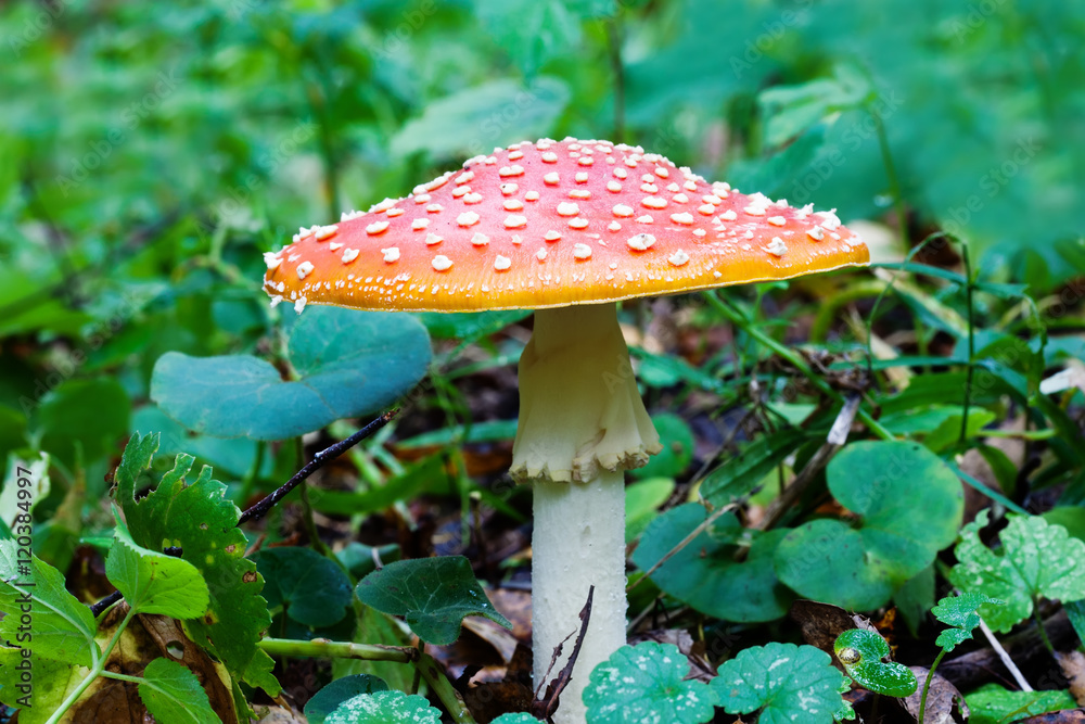 Fly-agaric amanita mushroom, green leaves background, macro view soft focus
