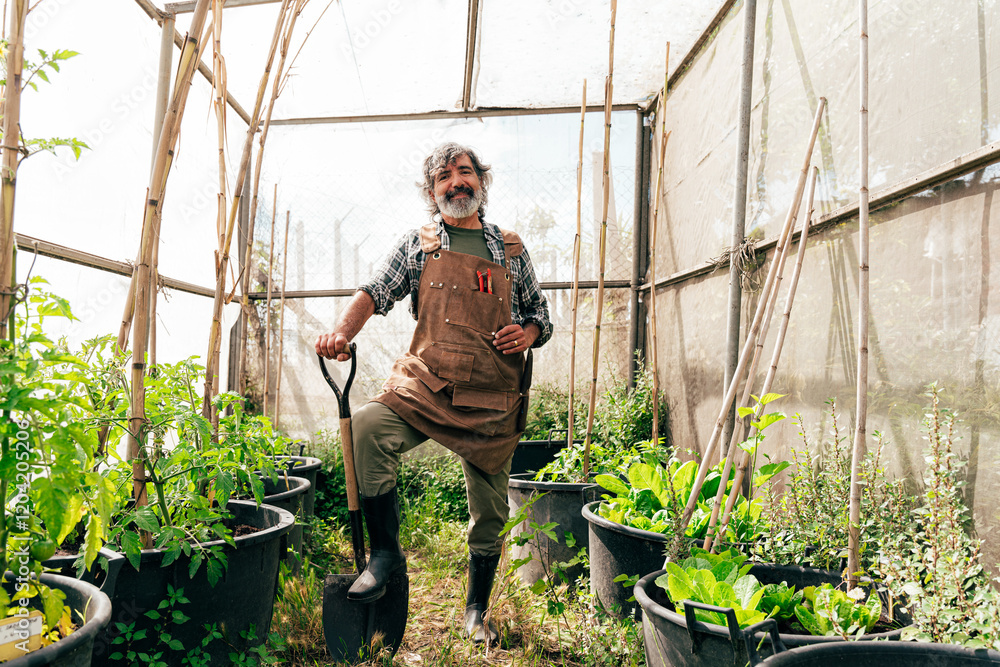 Farmer senior man working in his farm and greenhouse. Concept about agriculture, farn industry, and healthy lifestyle during seniority age