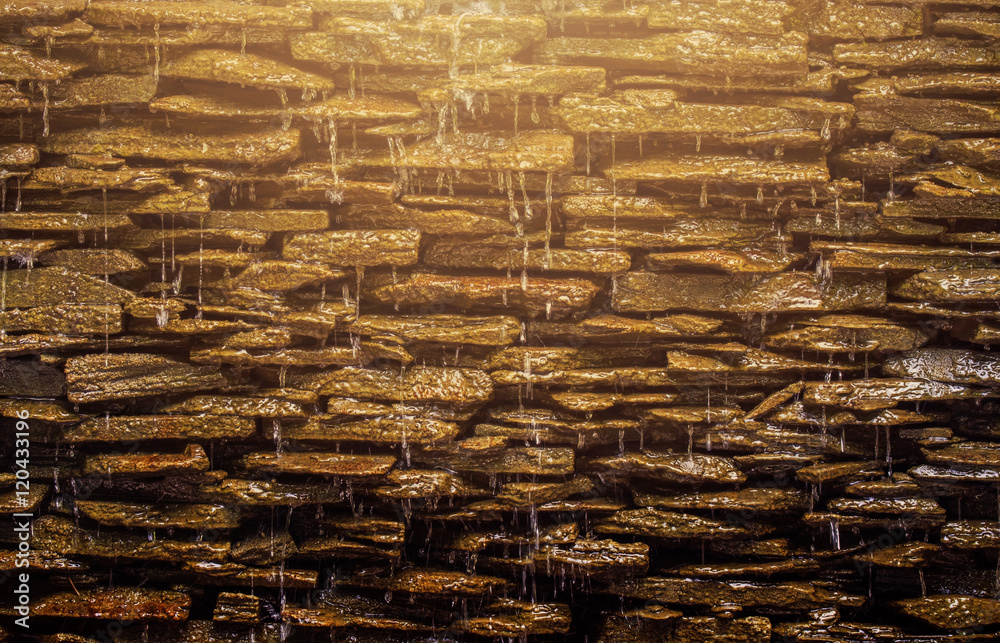 waterfall with sunset light on stone background