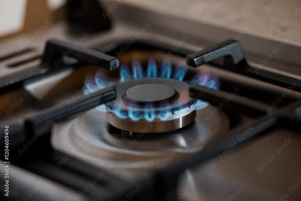 Thrilling Blue Flames Erupting from a Gas Stove Burner in a Modern Kitchen