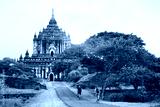 Tourists riding bicycle near pagodas in Bagan on sunset