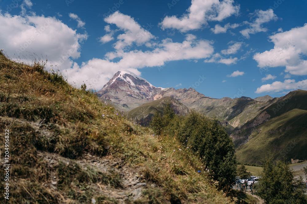 The stunning landscape of the North Caucasus. Kazbek mountain on the background of a mountain valley. Summer atmosphere in the mountains