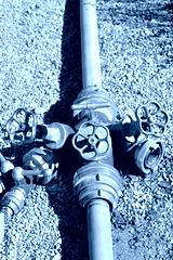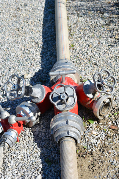 A fire hose with a splitter, corresponding valves, and connectors on a gravel surface
