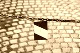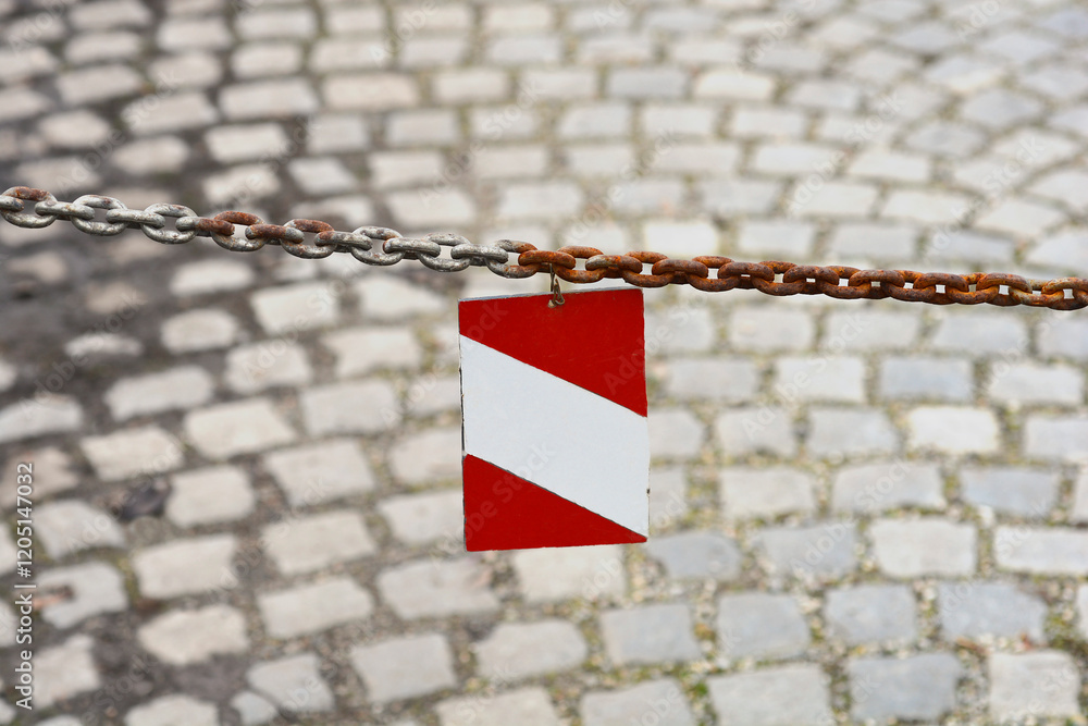 Metal chain barrier with a red and white sign placed in front of a paved surface