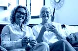 Pleasant moments in family, happy senior woman sitting on sofa with her blonde daughter enjoying together a break with a coffee cup