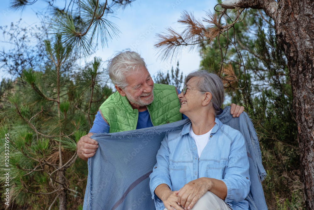 Cheerful senior couple sitting outdoors in the woods exchanging cuddles. Two elderly people enjoying nature and healthy lifestyle in retirement