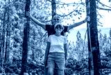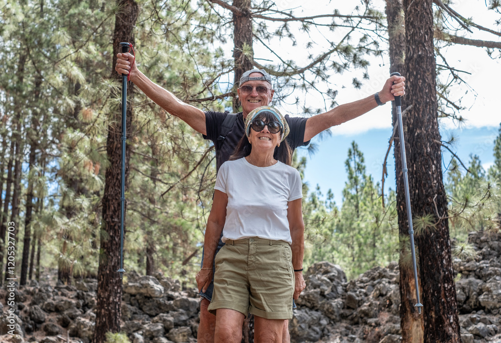 Joyful senior couple enjoying mountain excursion expressing happiness and well-being. Cheerful man and woman look smiling into the camera