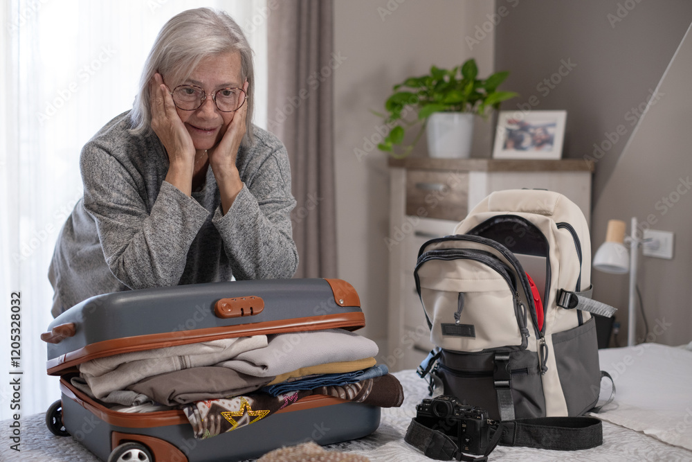 Mature female unable to close bag, full suitcase concept, senior woman packing, preparing luggage case, luggage of clothes, travel trip or journey voyage.