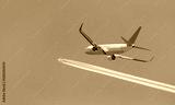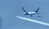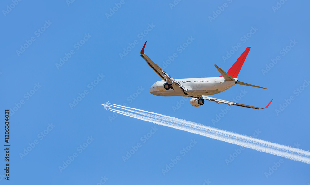 Trail of white smoke from the airplane on blue sky, airplane heavy traffic in the sky