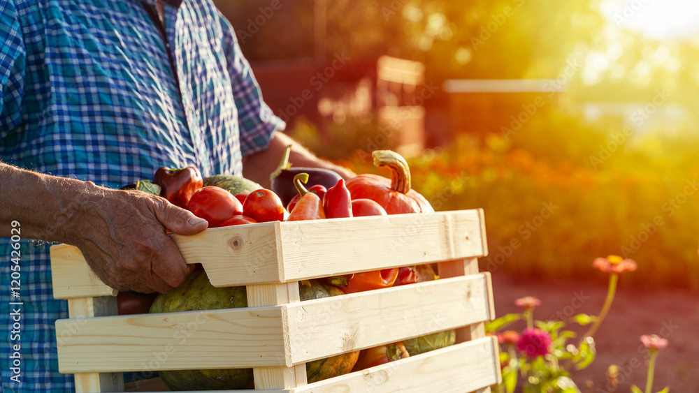 farmer with a box of vegetables and fruits in the garden plot