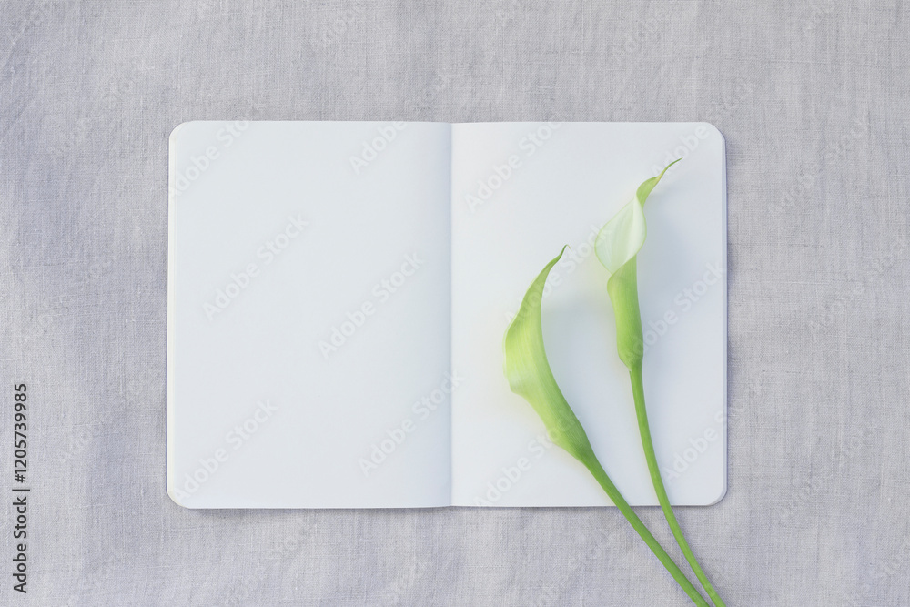 Two white Calla lilies are attached to a white notebook on a gray background with an overhead spread