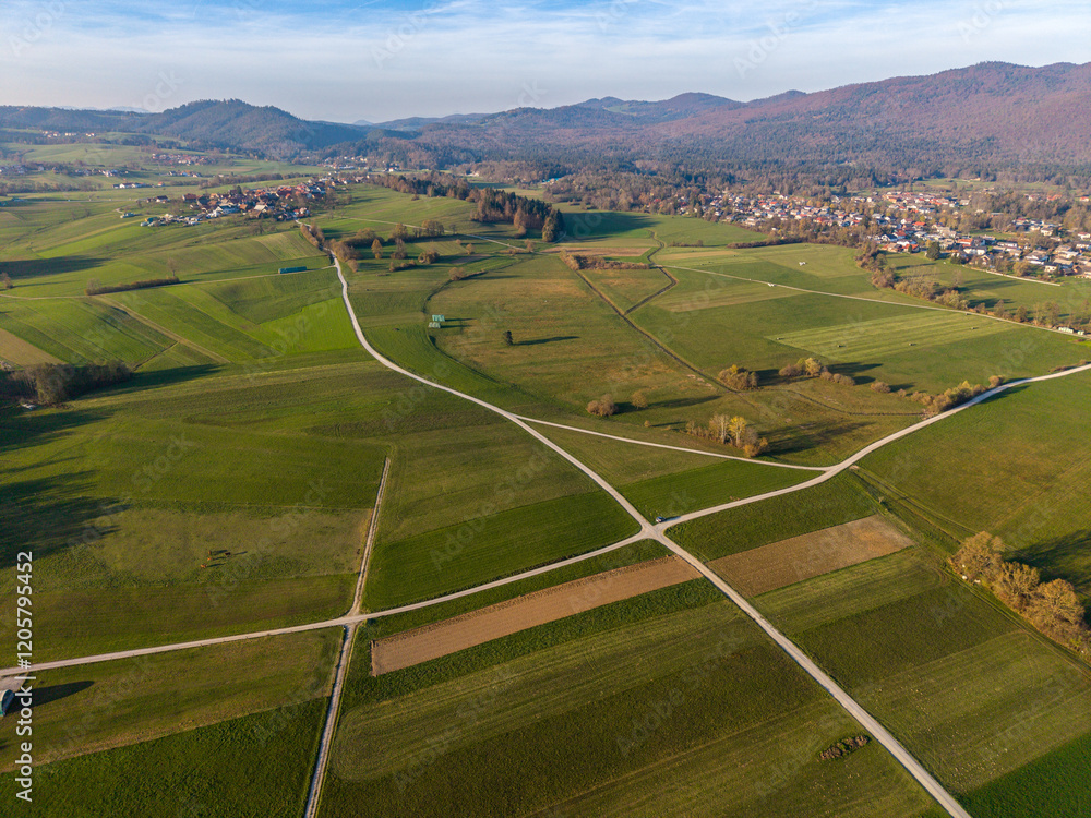 Aerial view of scenic rural landscape with fields and crossroads