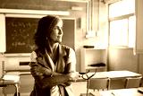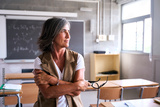 A teacher stands alone in an empty classroom, gazing thoughtfully out of the window. The scene captures a moment of reflection, introspection, and quiet contemplation in an educational setting