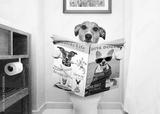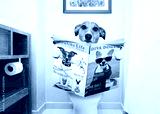 dog on toilet seat reading newspaper