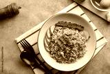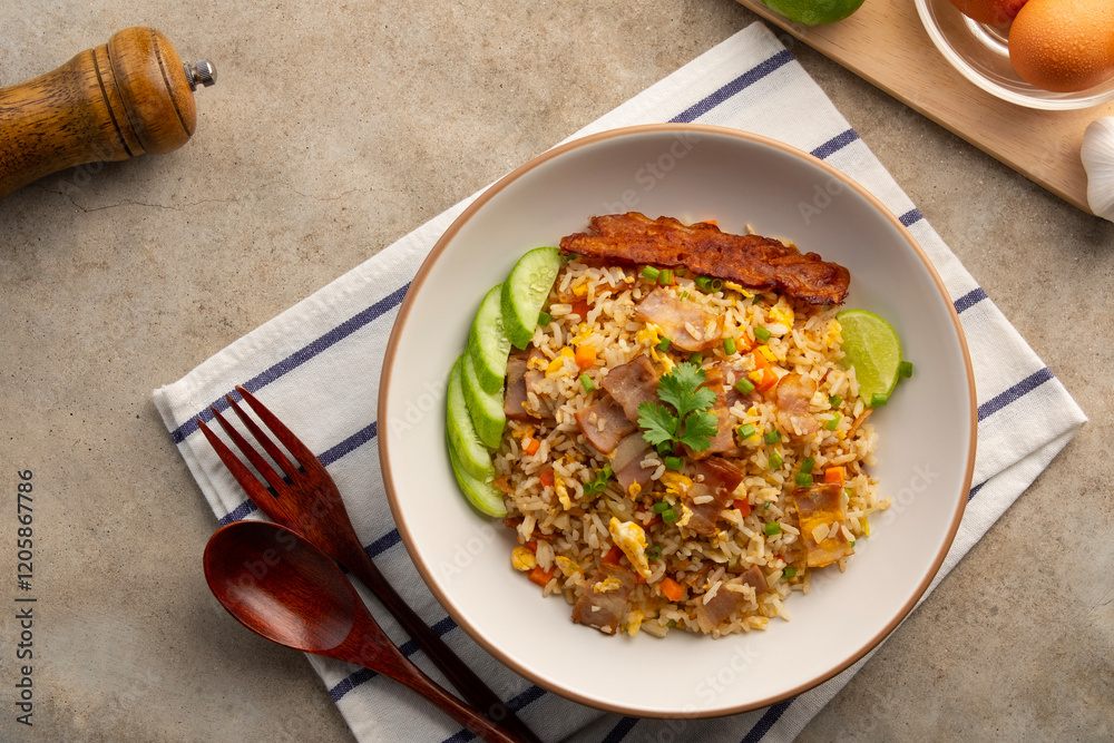 Fried Rice with Crispy Bacon.Stir fried jasmine rice with bacon carrot and eggs in white plate.Top view.