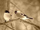 A pair of bullfinches quarrel on a tree branch in a winter forest