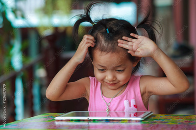 Happy child playing tablet with little fuddle.