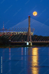 Warsaw, Poland - July 20, 2016: Panoramic view of the rising fullmoon over the National Stadium and Swietokrzyski Bridge in Polish Capital.