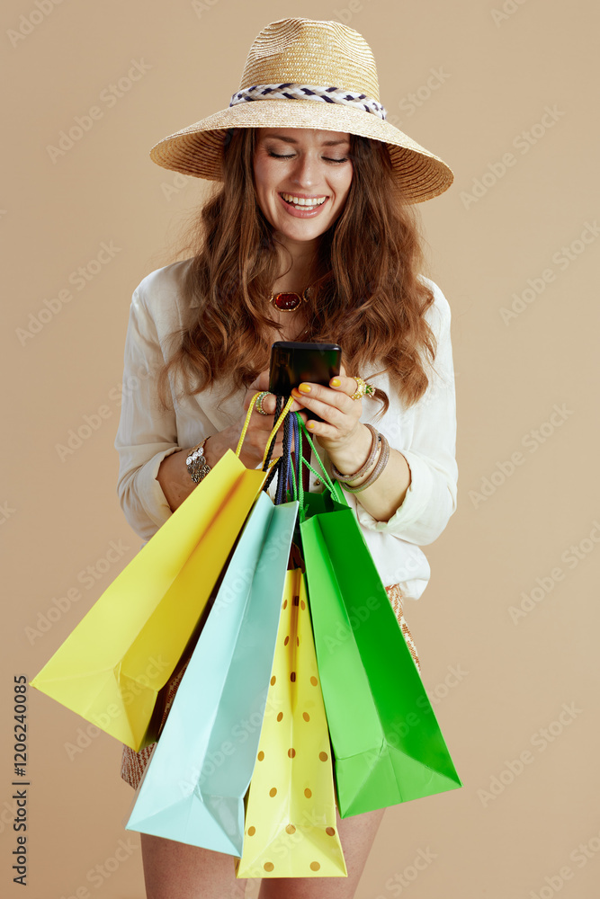 happy trendy housewife in blouse and shorts on beige