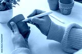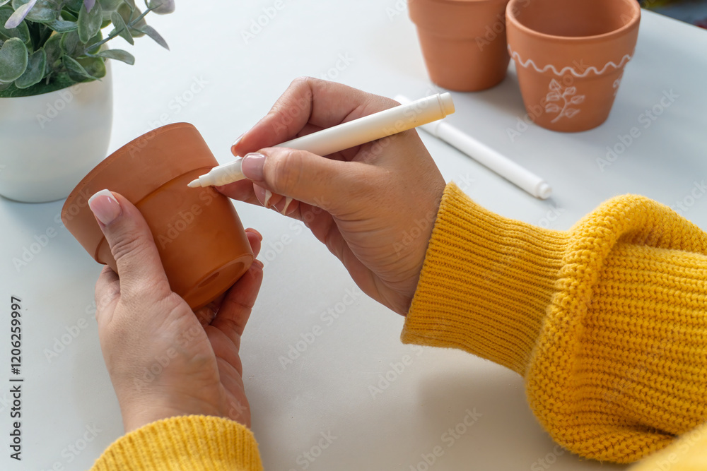 Close-up of womans hands in a cozy yellow sweater painting on a clay pot